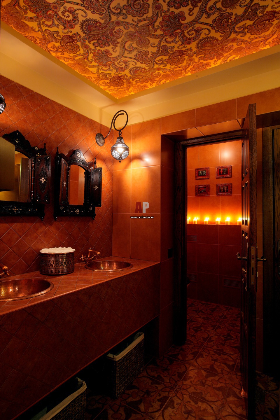 Раковины и смесители в санузле медные. Они выполнены арабскими мастерами. Марокканские зеркала в резных ажурных рамах с раздвигающимися створками.