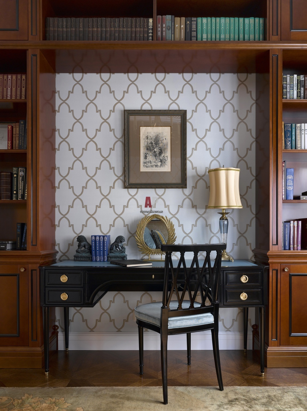 Кабинет выполнен в строгом английском стиле. Голубые обои, Thibaut. Письменный стол, стул, Salda. Библиотека, на заказ.