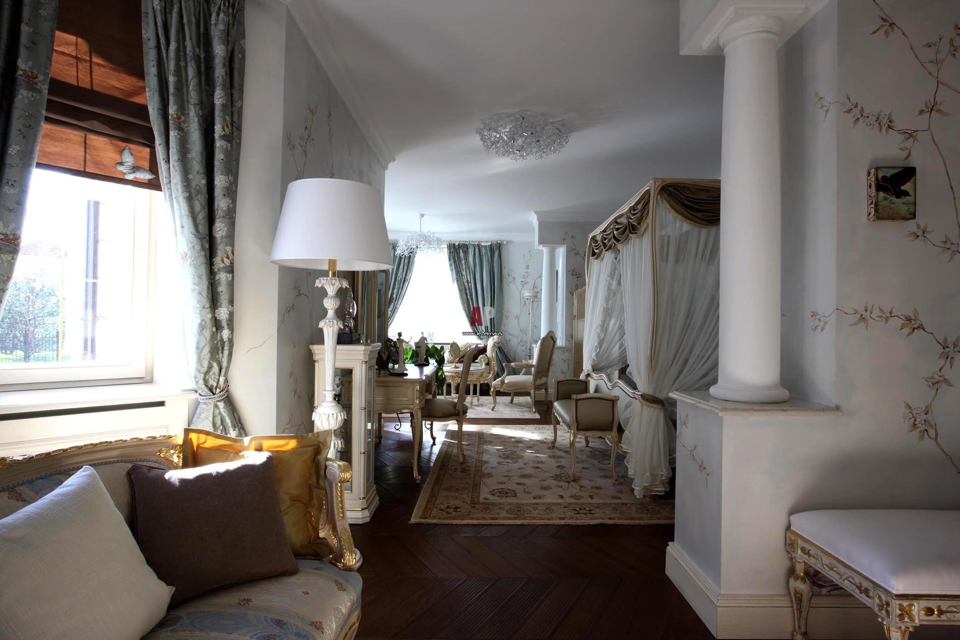 Интерьер зоны будуара в спальне хозяйки дома. Лепной орнамент изготовлен на заказ в мастерской Musaveroff.