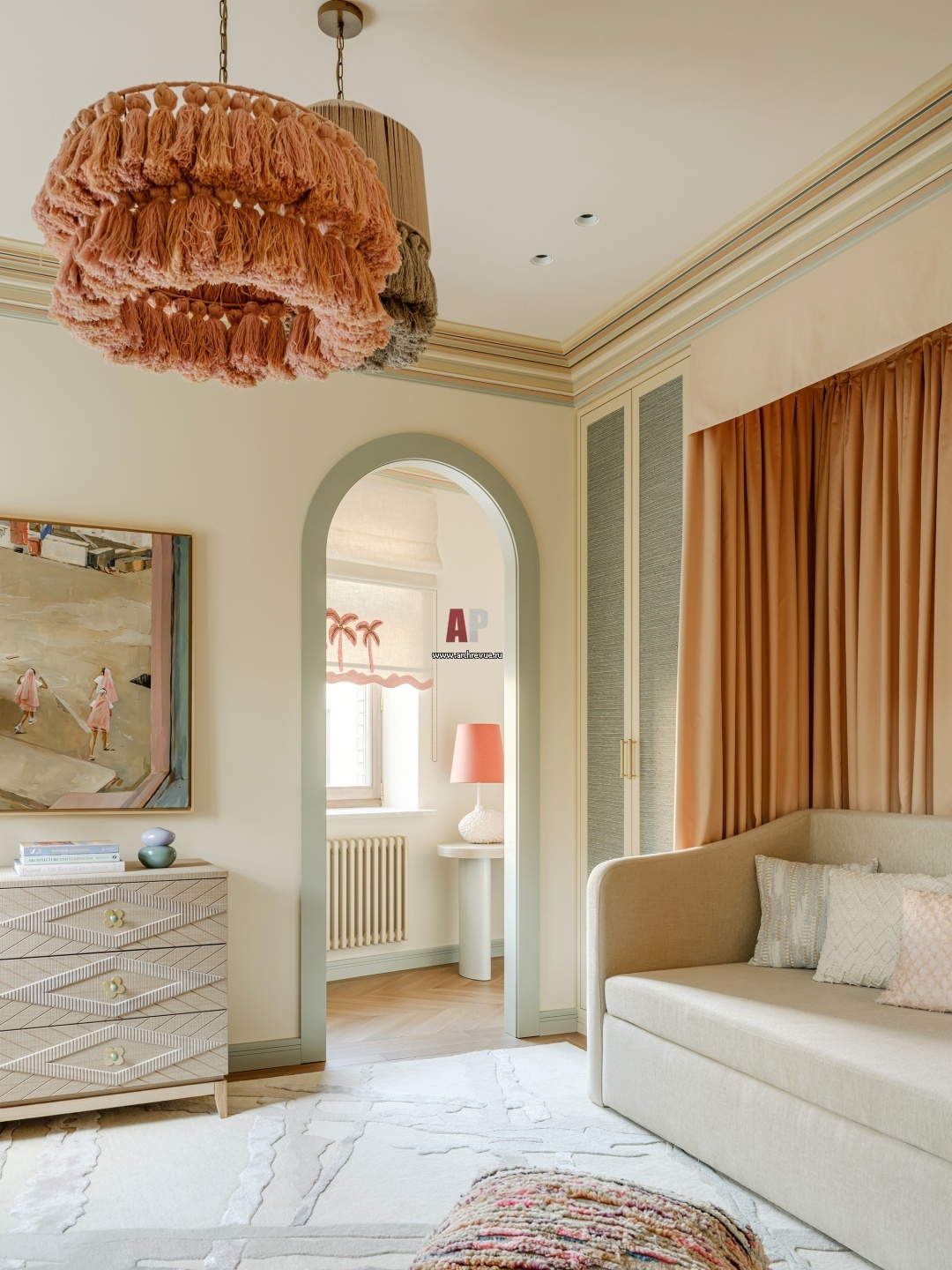 Гостевая, в перспективе детская, комната. Римские шторы, абажуры ламп, кисточки на люстры – все с ручной вышивкой по дизайну автора проекта. Фасады встроенного шкафы декорированы плетенными соломенными обоями. Они создают марокканское настроение.