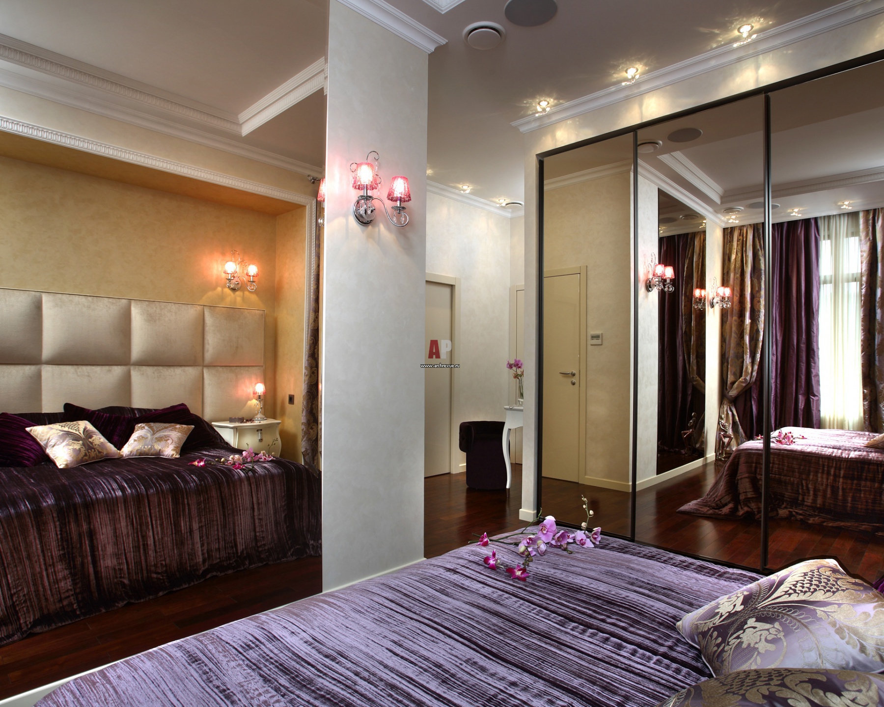 Фото интерьера спальни с зеркалами. Справа за раздвижными зеркальными панелями располагается большая гардеробная.