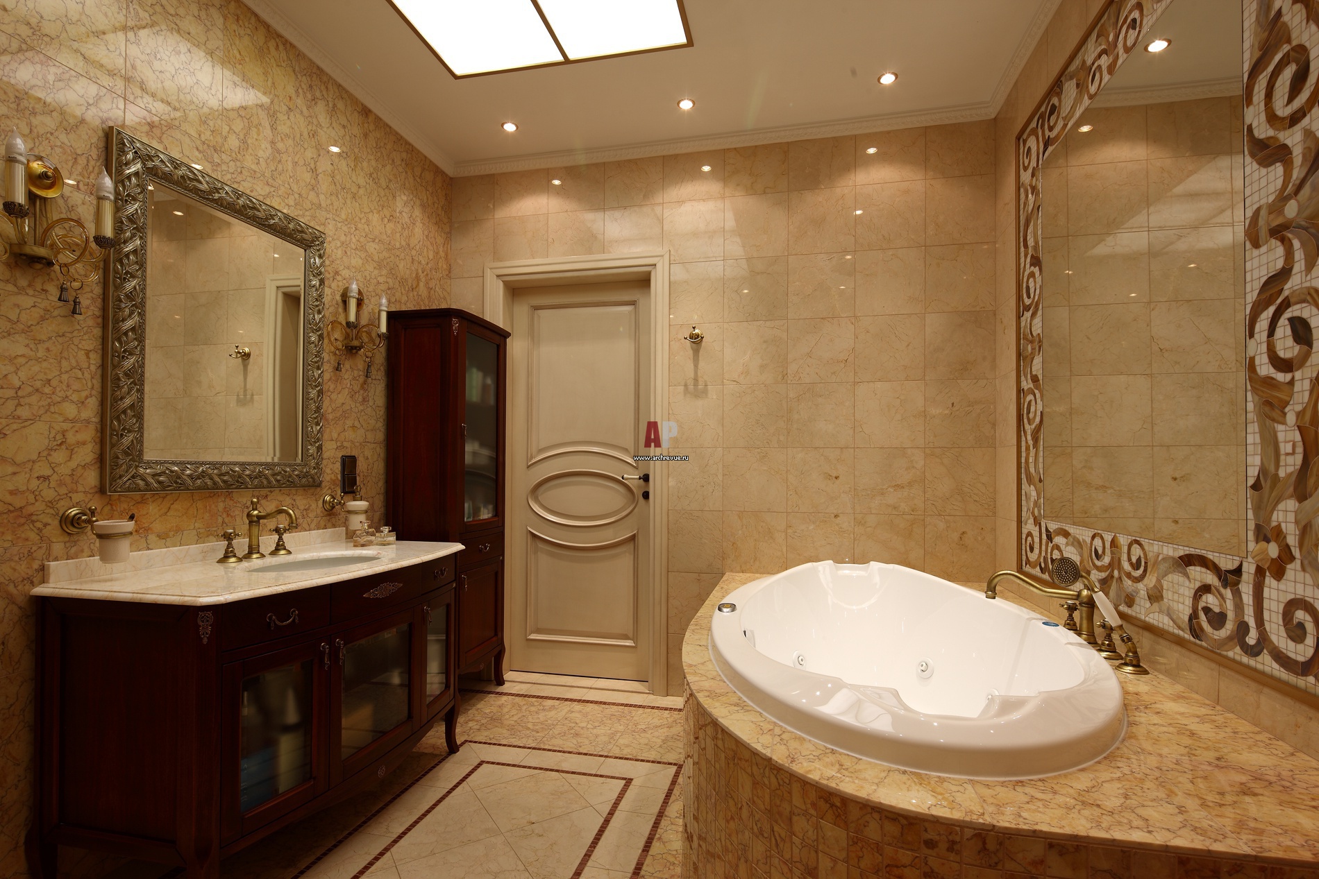 Украшение гостевого санузла – мозаичное обрамление зеркала. Флористический мозаичный рисунок выполнен по эскизу архитектора мастерами компании «Студия Натальи Кавериной».