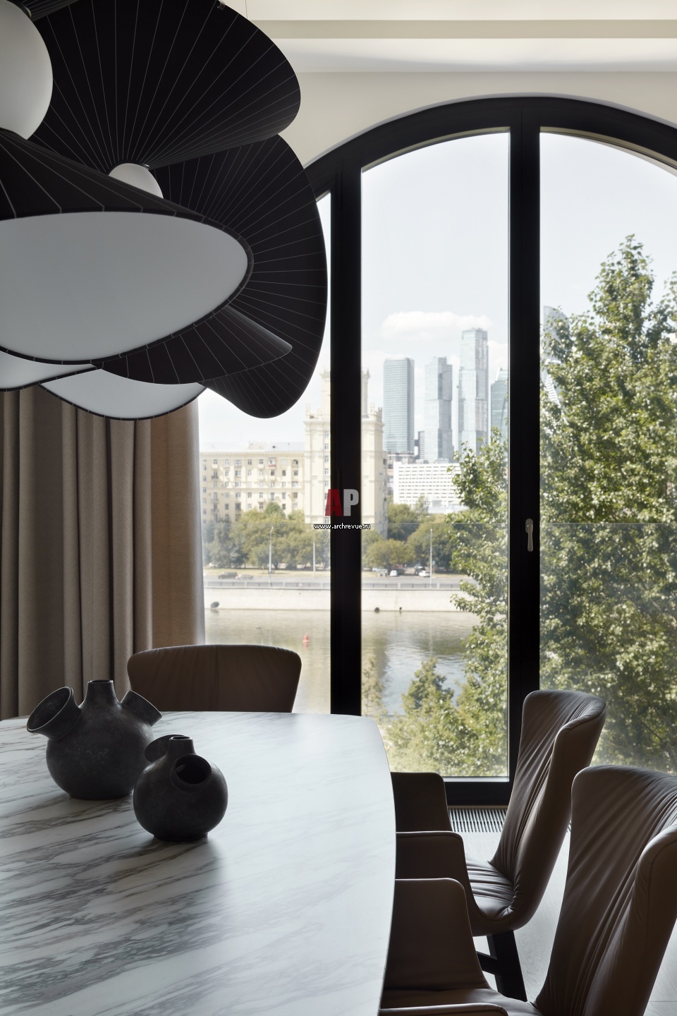 Дизайнерская квартира с отделкой white box. Столовая. Столешница стола Poliform выполнена из натурального мрамора.