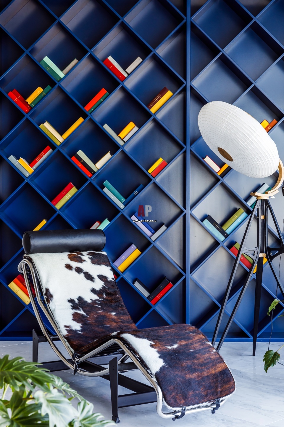 Открытый книжный стеллаж в гостиной насыщенного синего цвета выполнен на заказ.