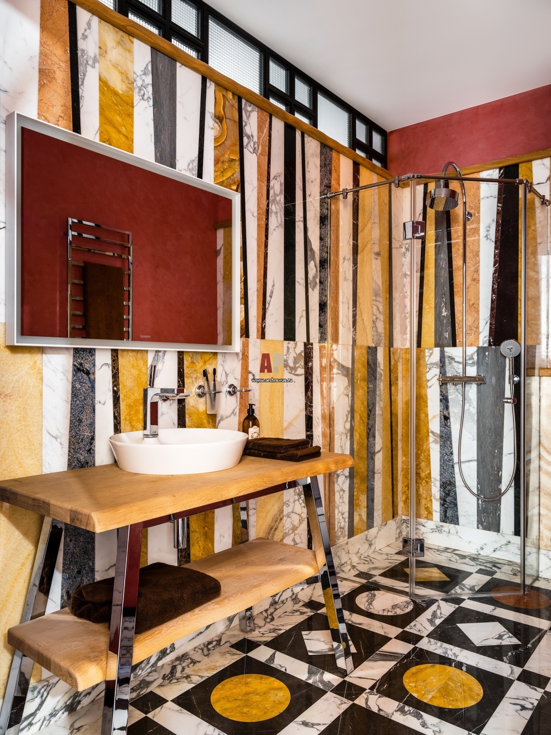 Полы и стены гостевого санузла оформлены авангардной мозаикой их натурального камня разных пород: мрамора, оникса. Естественный свет в помещение проникает через сквозные окна-фризы рифленого лофт-стекла. Сантехника, Duravit, коллекция CapeCode. Смесители, душевая, аксессуары, Hansgrohe.
