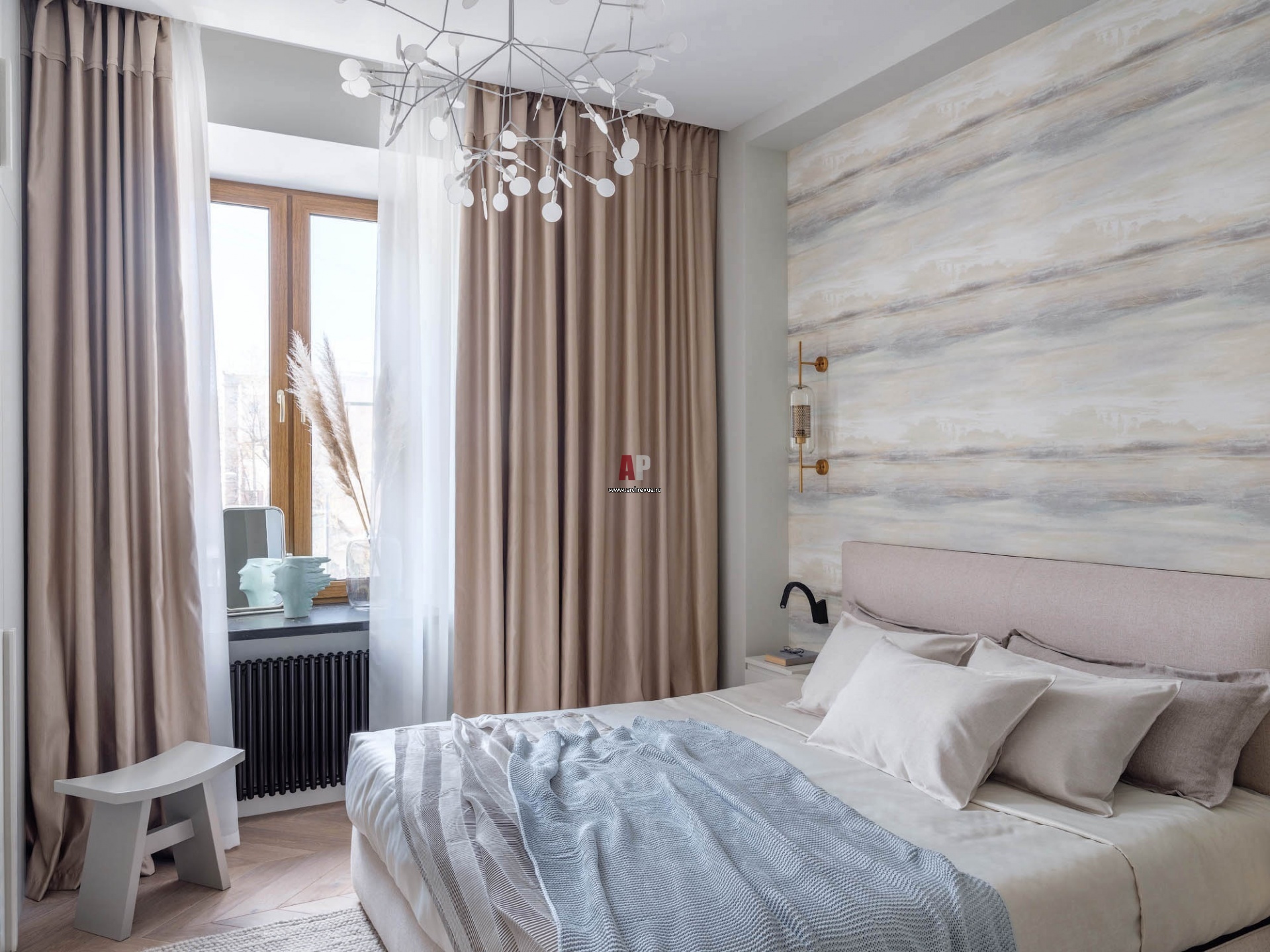 Спальня получилась небольшая (13 кв. м), но очень уютная за счет прохладной бежево-голубой користики и встроенного шкафа одного цвета со стенами. Кровать, Molteni&C, модель Ribbon. Обои с акварельным рисунком, York Wallcoverings , коллекция Candice Olson Tranquil.