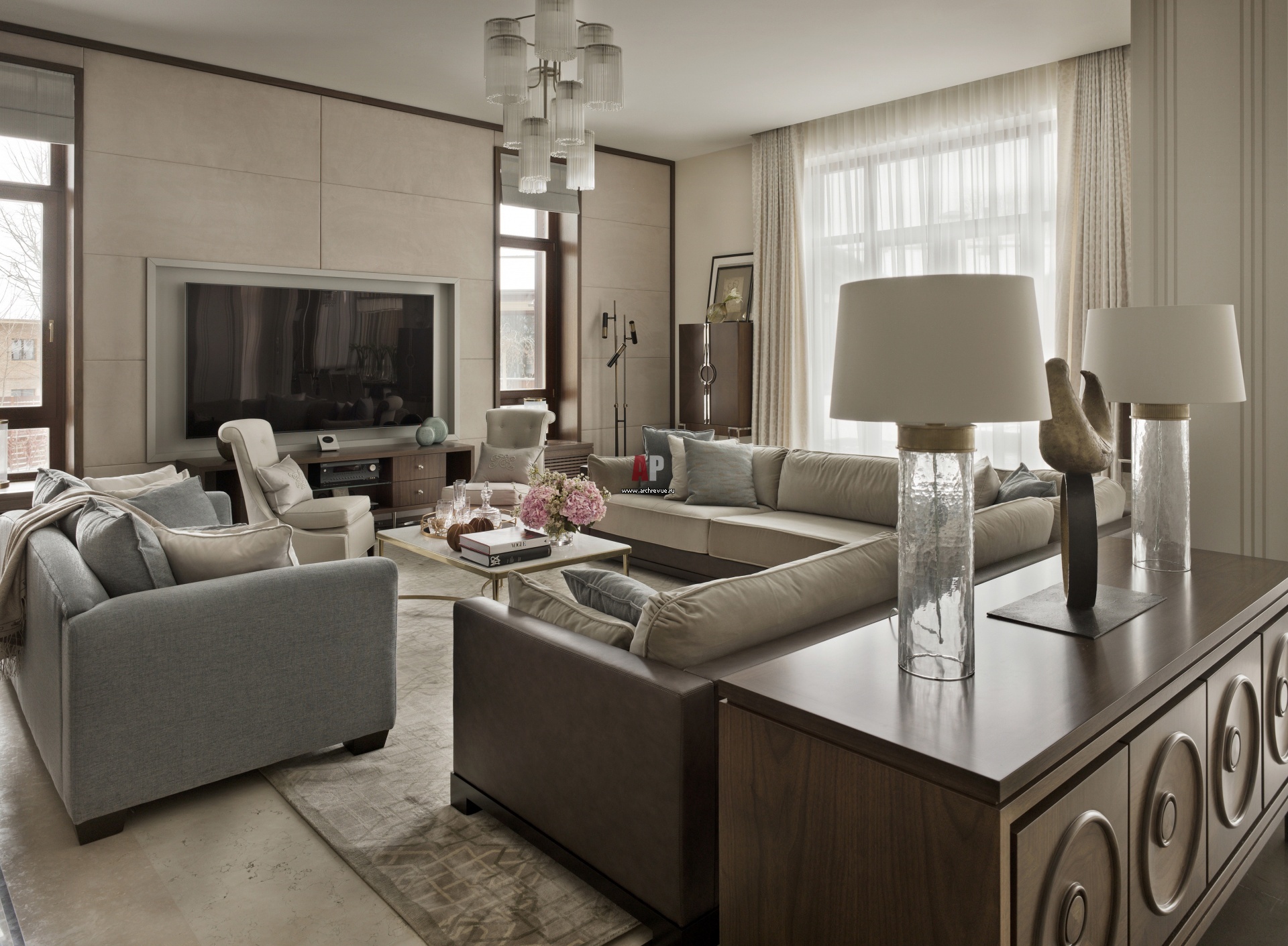 Диванная группа в гостиной в стиле ар-деко. Стены зашиты панелями из алькантары теплого светло-кофейного оттенка, они приятны на ощупь. Центральная люстра – оригинал в стиле ар-деко 1920-х годов.