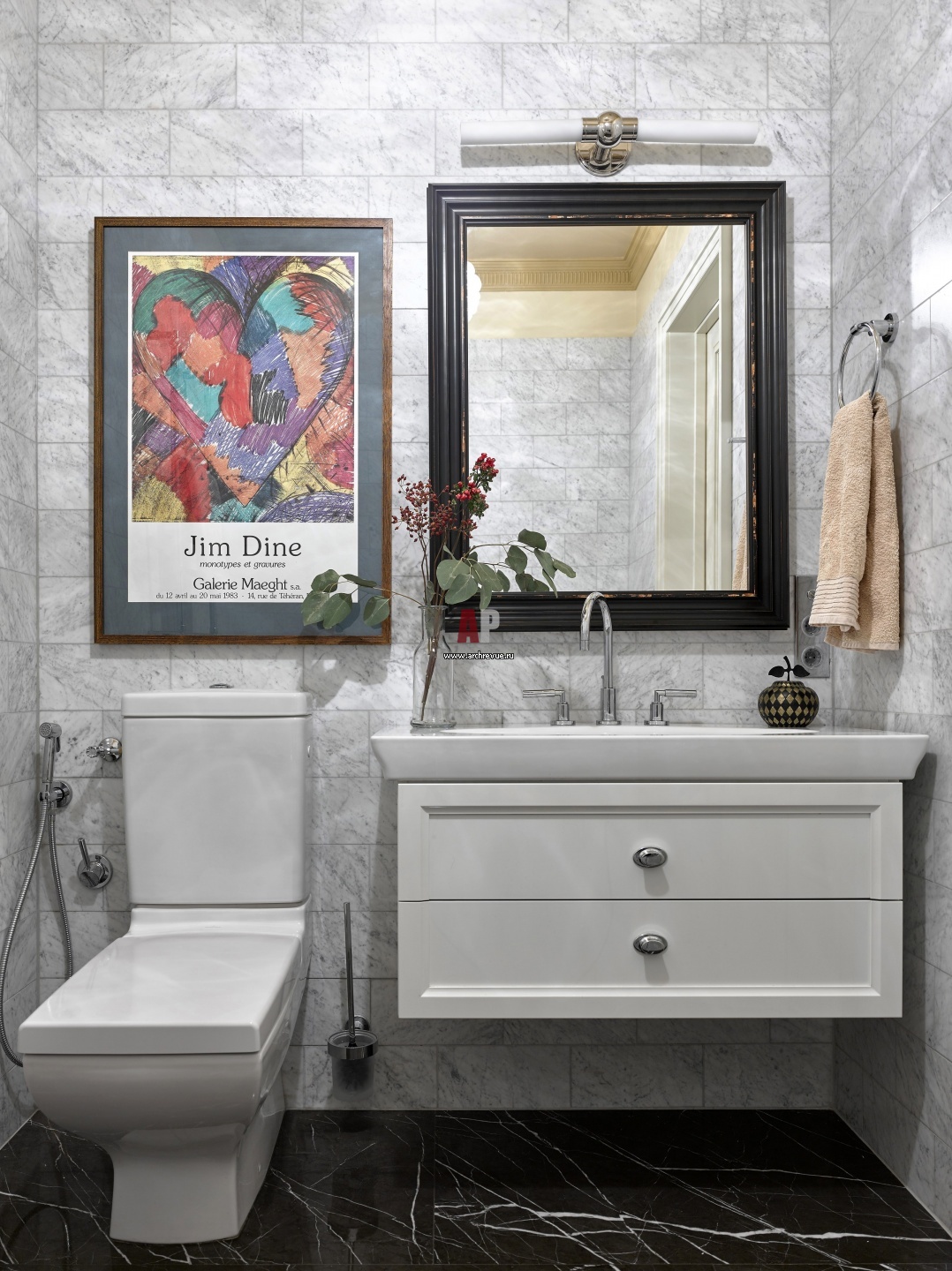 Фото интерьера санузла. Стены и пол облицованы белым с серыми прожилками мрамором. Раковина, унитаз, Villeroy & Boch.