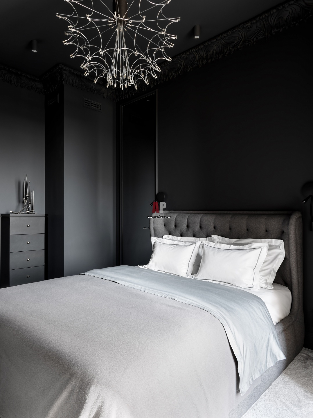 В мастер-спальне для окраски использована краска Benjamin Moore & Со. Для стен, более темная – оттенок 2126-20. Для потолка, более светлая – оттенок 2126-30. Из-за особенностей человеческого восприятия, нанесенные на разные поверхности, они выглядят одинаковыми. Скрытая дверь ведет в санузел.