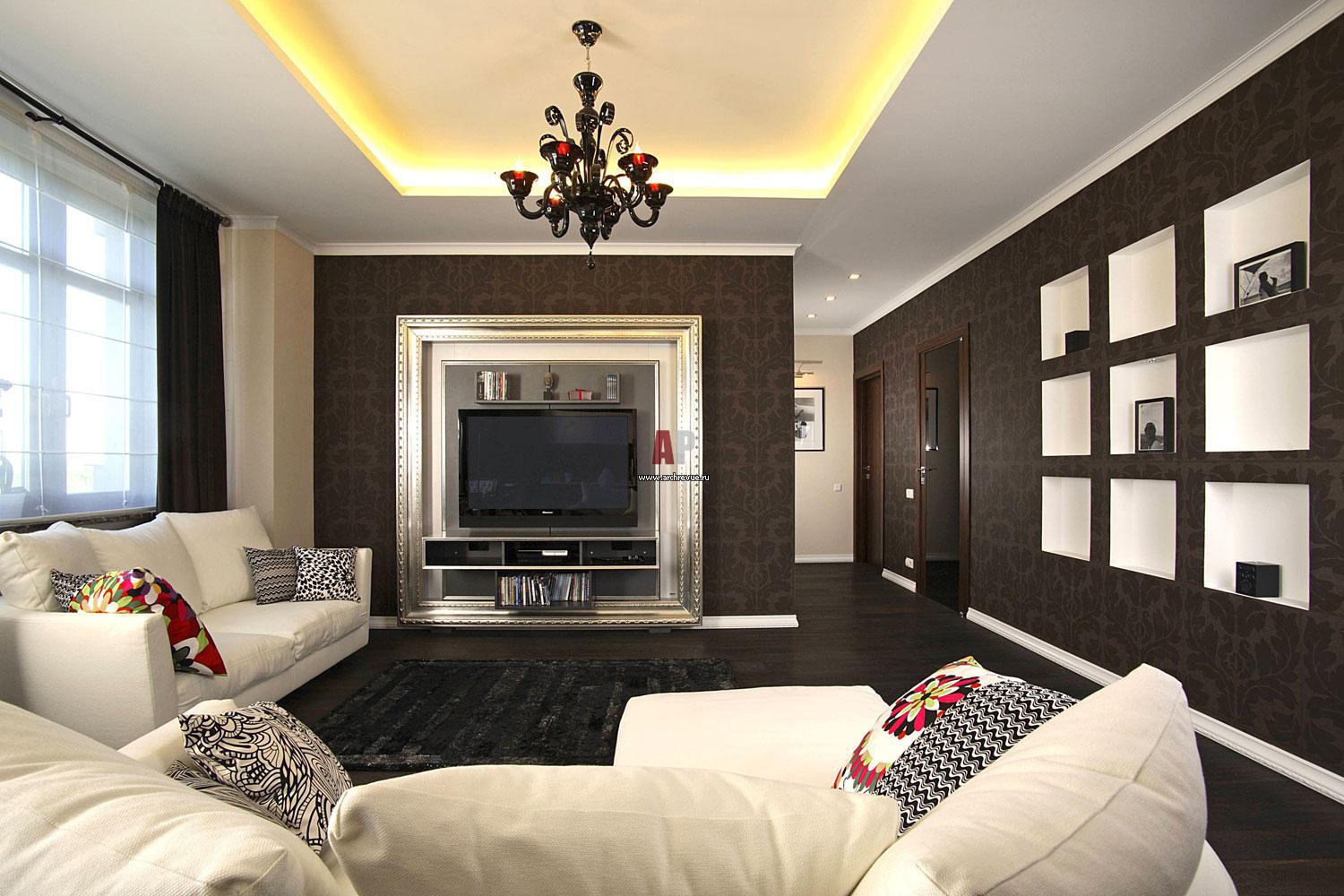 Доминанты гостиной – пышный багет, обрамляющий зону TV, поставщик «ТРИО-Интерьер», шоколадные обои с фактурой под кожу и цветочным орнаментом.