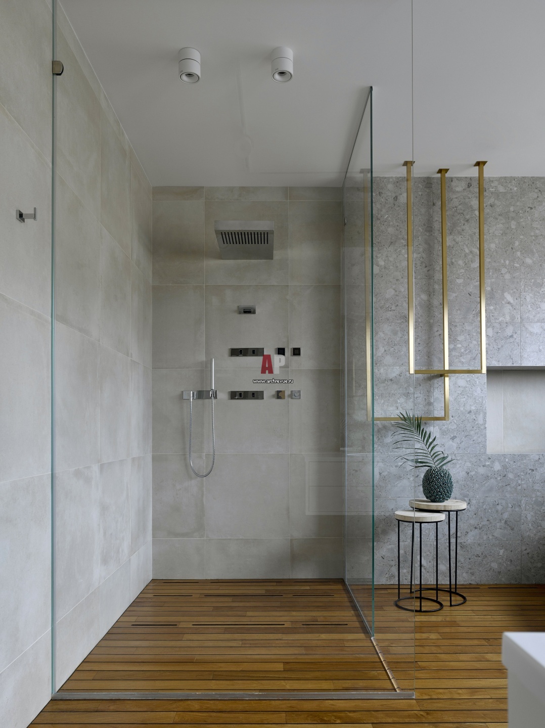 Зона душевой в хозяйской ванной комнате выполнена в современном стиле. На полу мокрой зоны использовано тиковое покрытие. Душевая СПА-система Vertical Shower Fitness, Dornbracht.