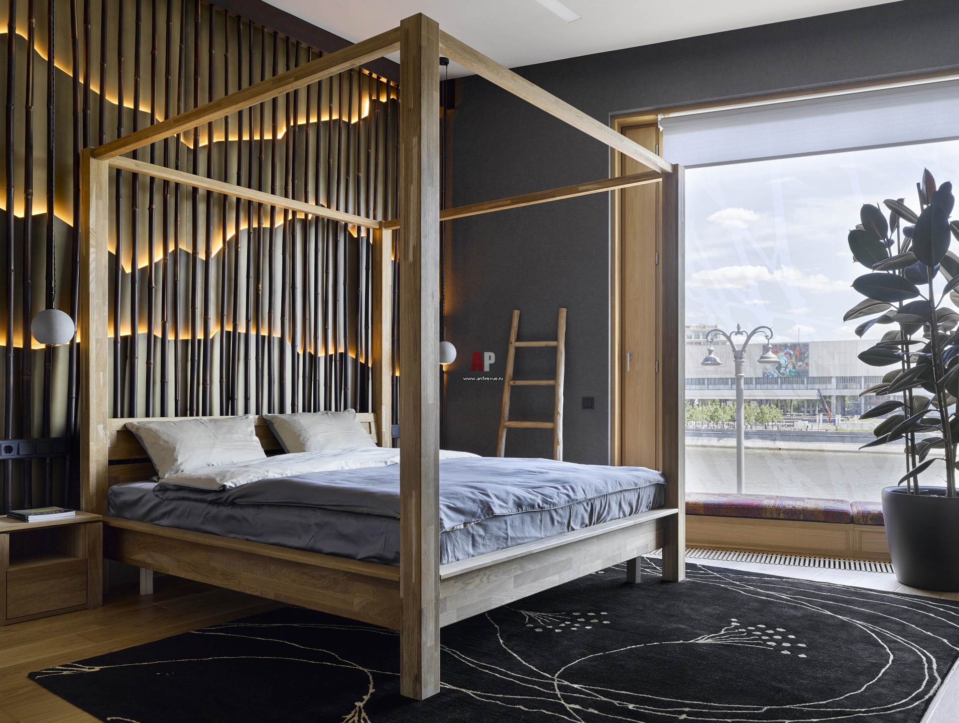 Хозяйская спальня с панорамным окном и видом на новую Третьяковку. Стеновая панель за кроватью – авторская работа главного дизайнера проекта Евгения Дунина. Она представляет собой композицию из многослойных листов МДФ, выкрашенных металлизированной краской с патиной, и натурального обожженного бамбука. Встроенная подсветка создает очертания гор за бамбуковым лесом.