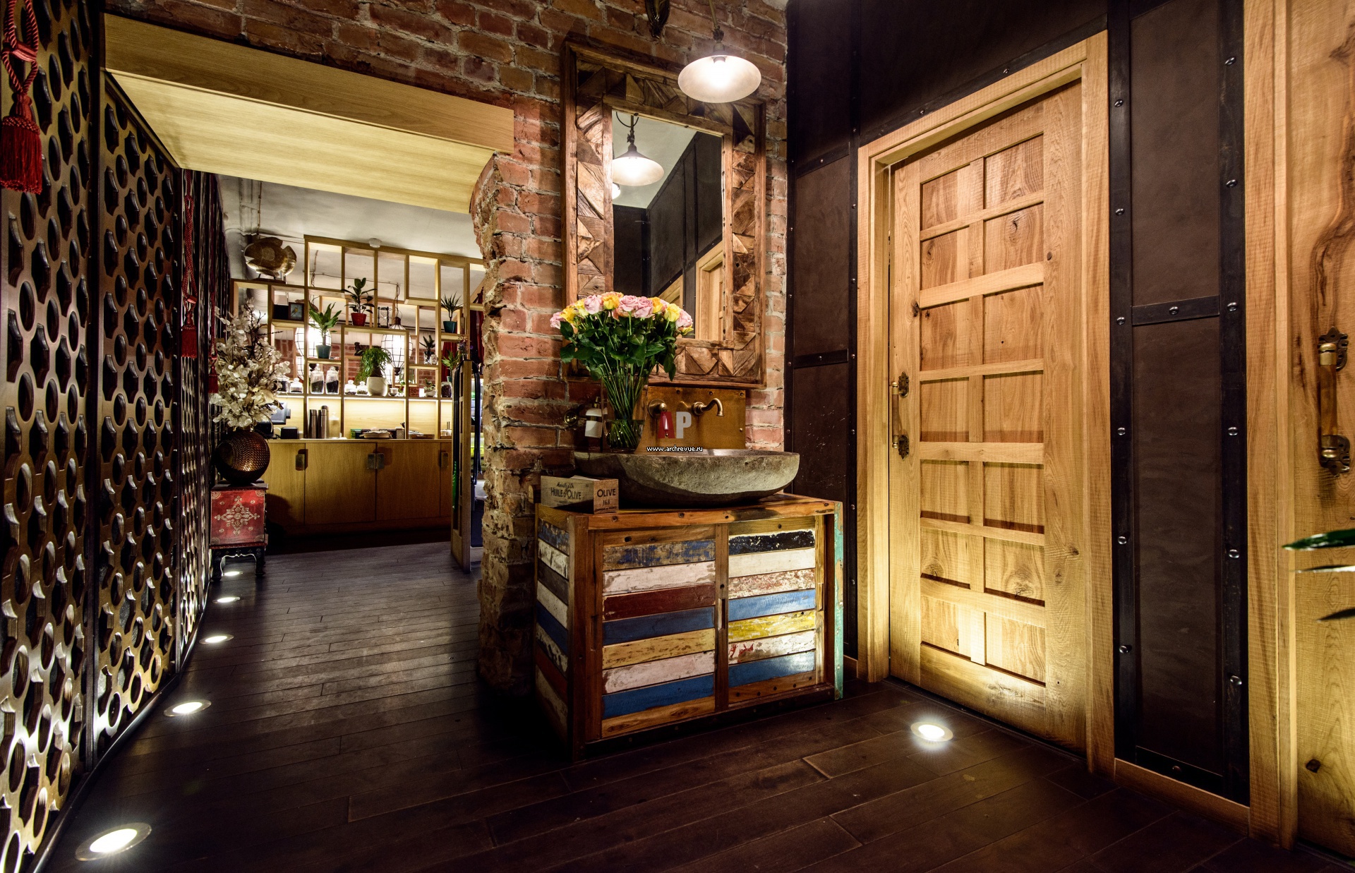 Блок санузлов находится в затемненной части пространства. Двери, умывальник выполнены из некрашеного массива дерева с поперечным спилом и обрезным краем. Раковина выполнена из камня.