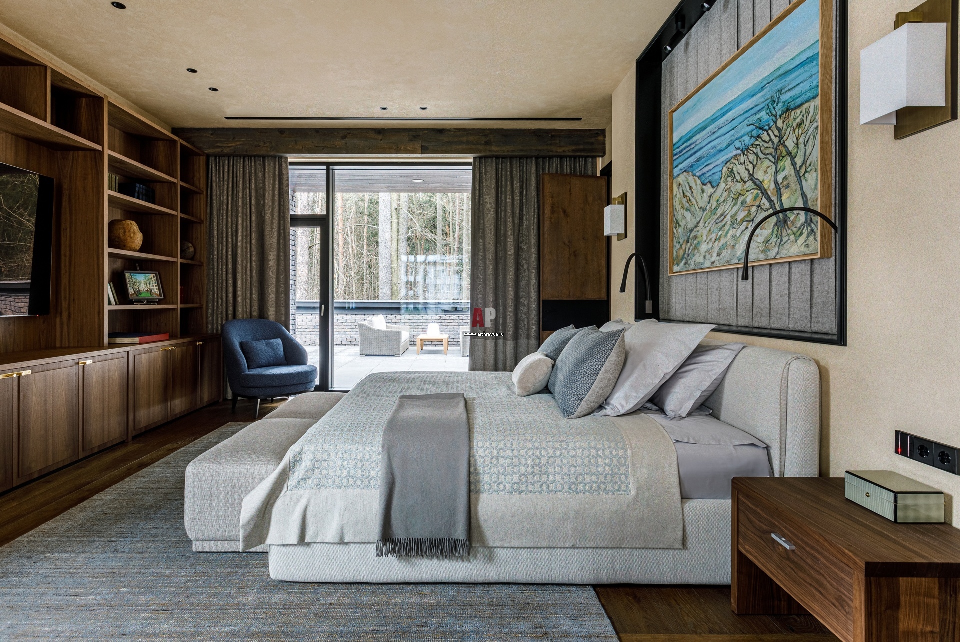 Мастер-спальня на втором этаже. Кровать и кресло, Mononova. Прикроватные тумбы, Riva 1920. Шторы из ткани, De Le Cuona. На стене за кроватью – работа Максима Кантора.