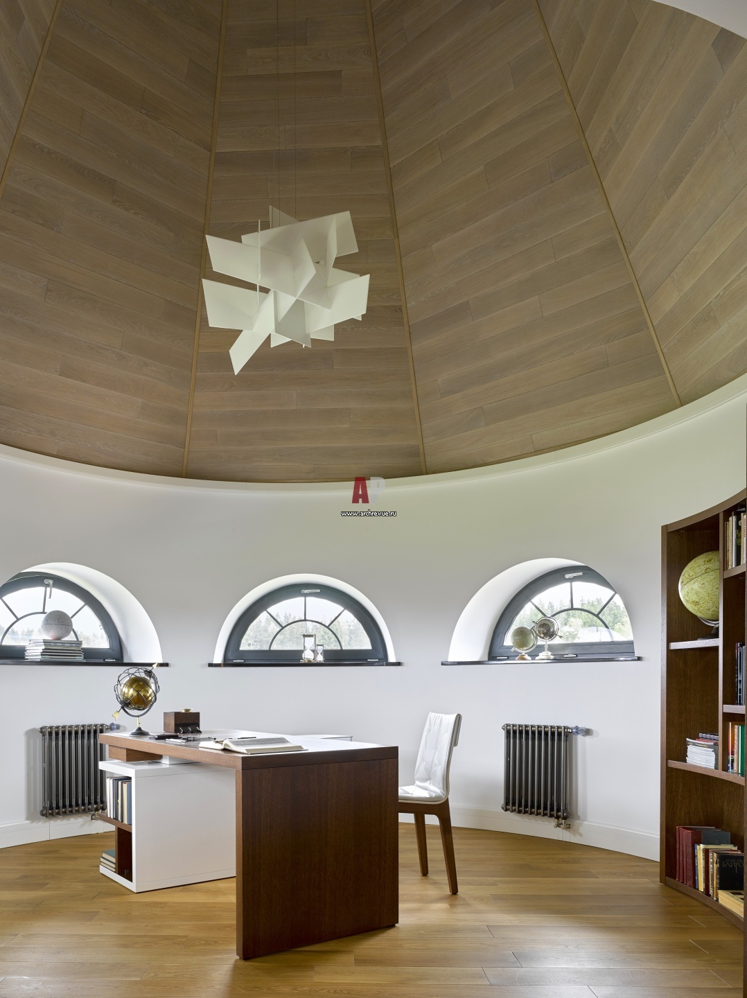 Апартаменты старшего сына с отдельным кабинетом на третьем уровне башни. Один из самых интересных элементов проекта – это сделанный по чертежам архитектора массивный поворотный рабочий стол, его можно развернуть в любую сторону, повернуть тумбы под 90 градусов. В пару к нему спроектирован полукруглый стеллаж, он повторяет радиус стены. Купольный потолок подшит деревом.