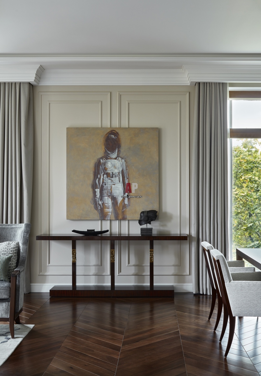 Гостиная. На оси со входом расположена консоль Theodore Alexander, модель Erno. На ней - арт-объект Music, автор Павел Михайлов. На стене – картина #1 работы Анастасии Копытцевой.