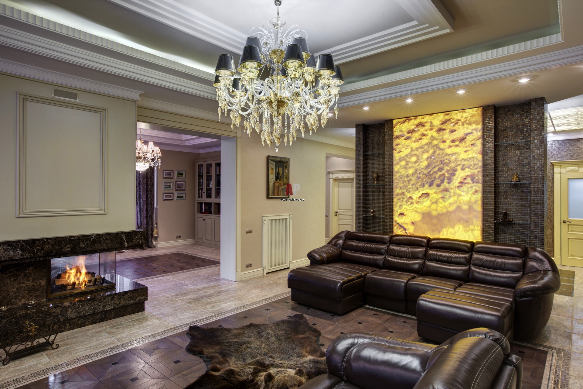 Диванная группа из шоколадной кожи с камином в гостиной. Художественная доминанта первого этажа – стена, с двух сторон облицованная ониксом. Слебы оникса в холле и гостиной совпадают по размерам, цвету и рисунку, каменная конструкция оснащена выкатной системой освещения.