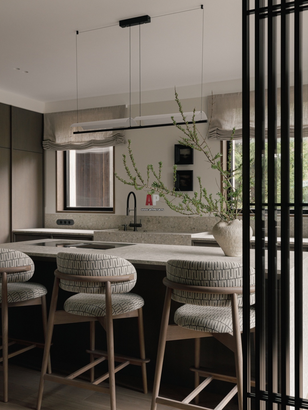 Двухэтажный деревянный дом на Истринском водохранилище. Кухня с остром для завтраков. Столешницы выполнены из серого камня. Фасады – темное дерево.