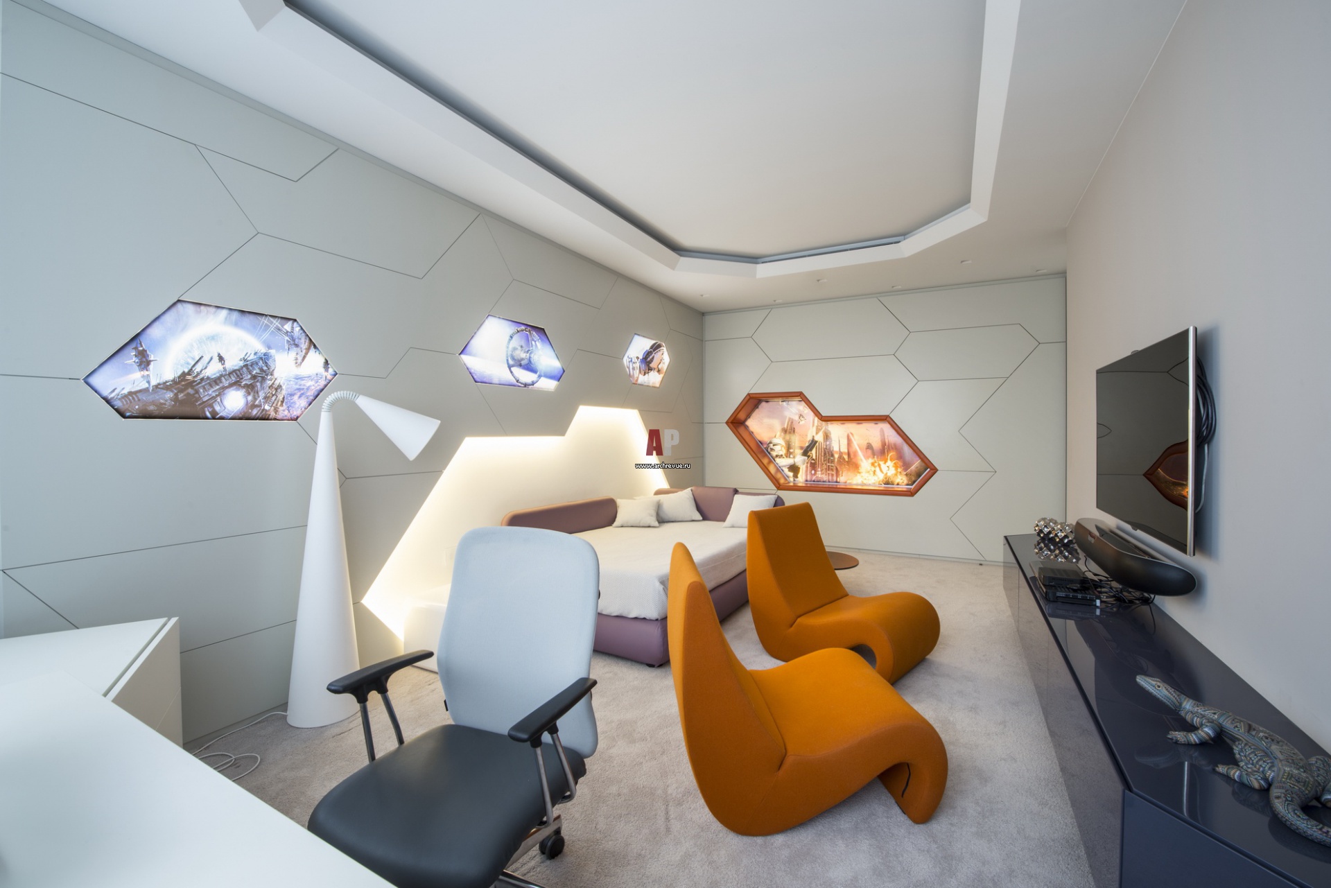 Стены детской – это огромный пазл, собранный из модулей сложной формы. Модули использованы закрытые и открытые, часть из них служат системой хранения. Светящиеся лайт-боксы со «Звездными войнами» съемные, сюжет панно можно менять. Система хранения, по индивидуальному проекту – изготовление «АФ Ника».