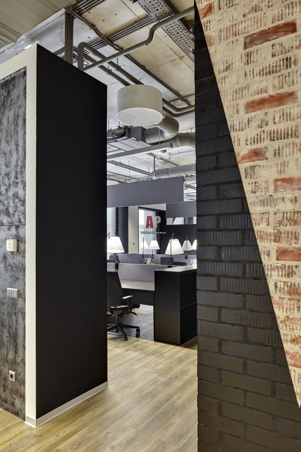 Интерьер рабочего лофта. В качестве ловушек звука использованы перфорированные информационные «облачка» черного цвета над рабочими местами.