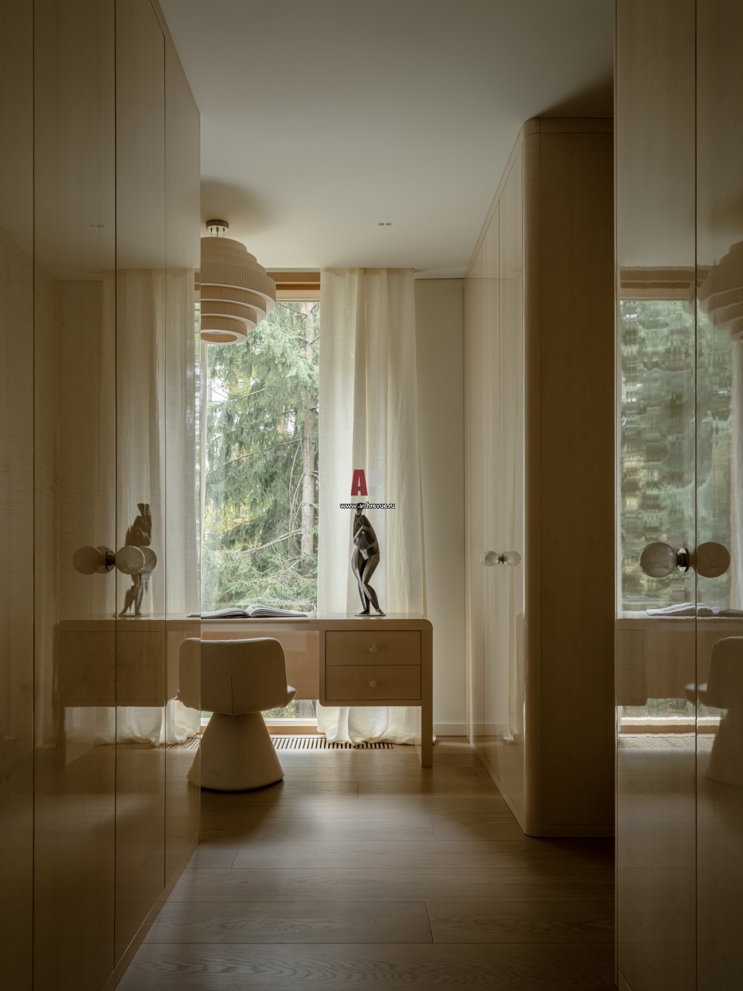 Женская гардеробная. Фасады шкафов сделаны скругленными, чтобы свет из окон мог мягко заливать проход в спальню, без лишних контрастов и теней.