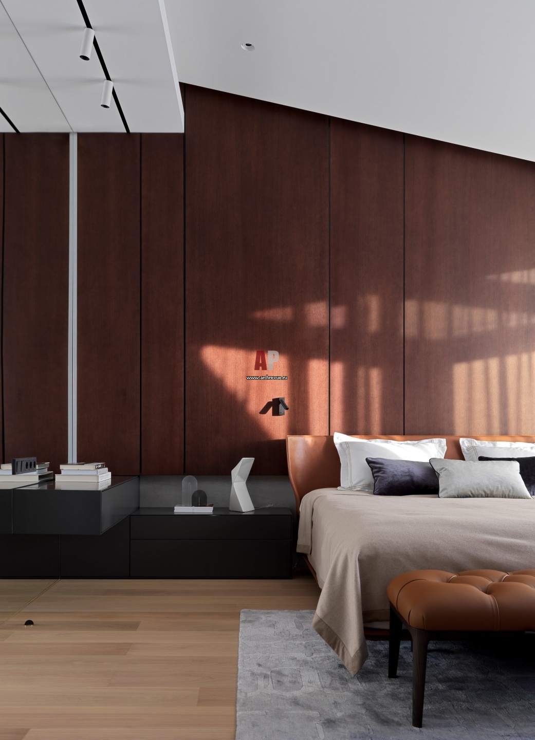 Хозяйская спальня. Стена за изголовьем кровати зашита панели из тонированного дуба.