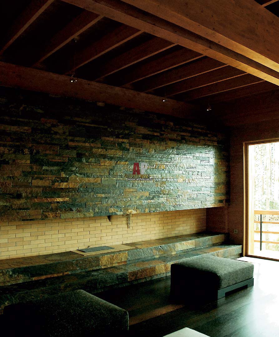 Минималистичный камин во всю стену выложен разноцветным сланцем, нарезанным «в лапшу».