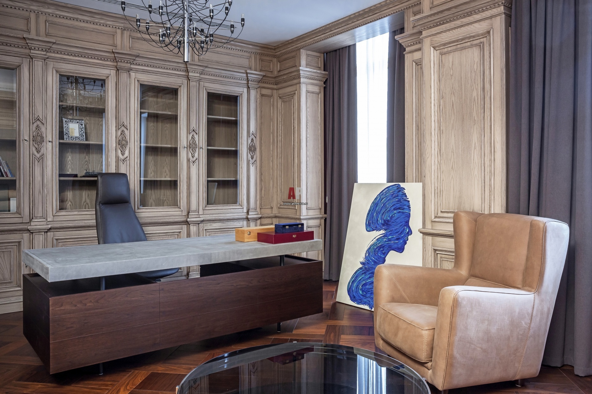 Заказчик хотел, чтобы кабинет выглядел респектабельно. Стеновые панели, стеллажи в стиле 19 века, тонированный дуб, Luciano Zonta. Многорожковая металлическая люстра, Flos. Письменный стол с каменной столешницей, рабочее кресло, Baxter.