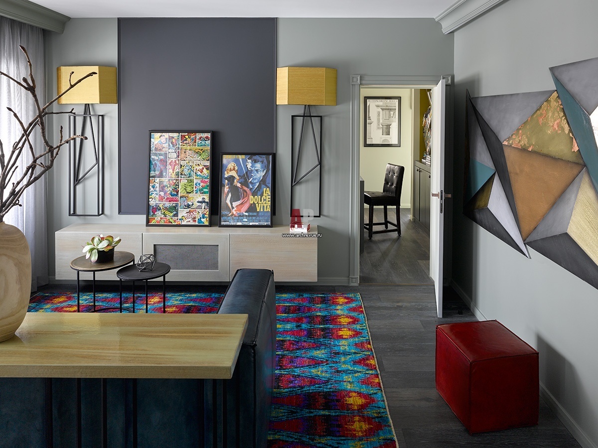 Интерьер гостиной. Диван из синей кожи, MHLiving. Ковер соткан из распущенных нитей сари, Италия. Светильники с черными металлическими основаниями, на заказ.