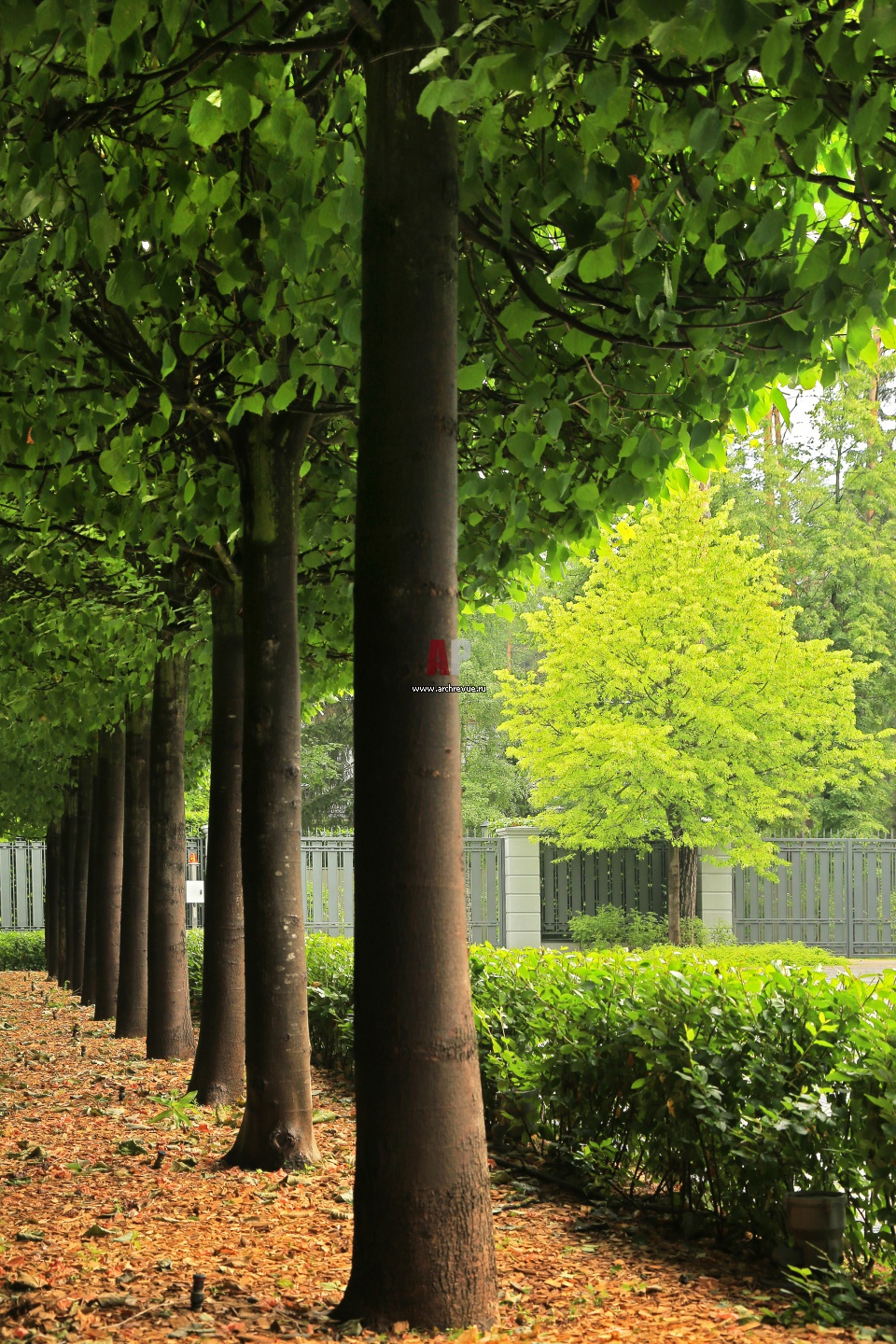 Формованная аллея вдоль парадного подъезда – лаконичное проявление топиарного искусства. Нижний ярус – формованный кизильник.