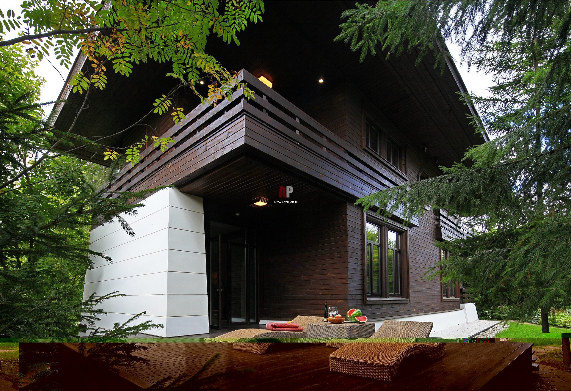 Небольшой дом в духе старой дачи. Открытая веранда перед домом.