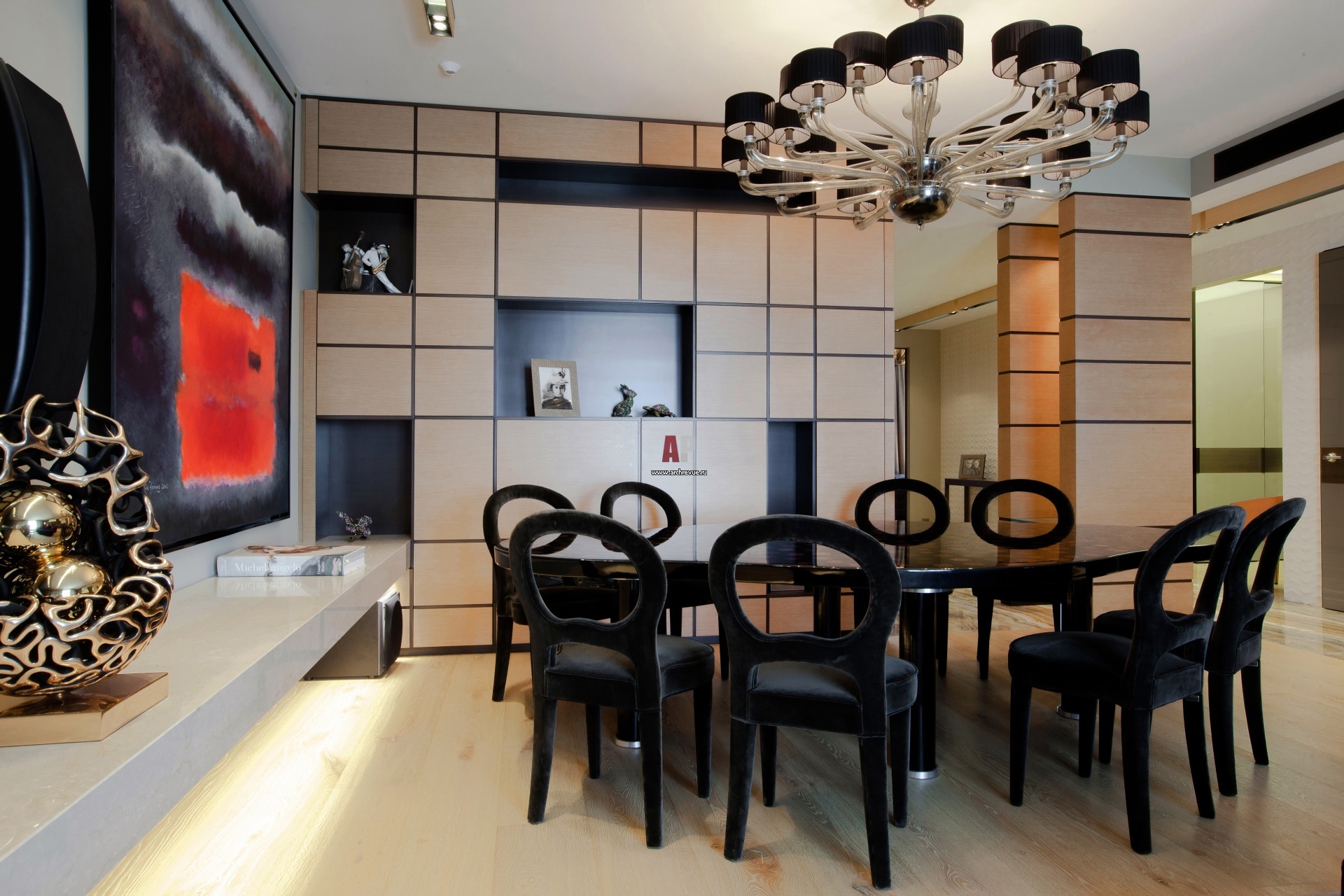 Интерьер современной гостиной. Перегородка обыграна как стеллаж с нишами разного размера и формы для хранения мелких предметов. Его фасад набран из дубовых панелей с бронзовой расшивкой, задник выкрашен в черный цвет. Изделия из дерева, изготовление «АФ Ника».
