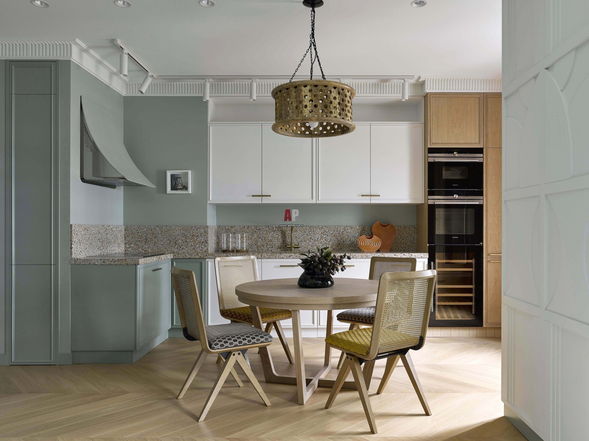 Кухня сделана на заказ по эскизам автора проекта. Ее угловая часть выкрашена в общий со стенам мятный оттенок, а колонна со встроенной техникой решена в натуральном дубе. Столешница и фартук выполнены из слэбов камня терраццо, Grandinetti. Стулья с ротанговым плетением, Roche Bobois.