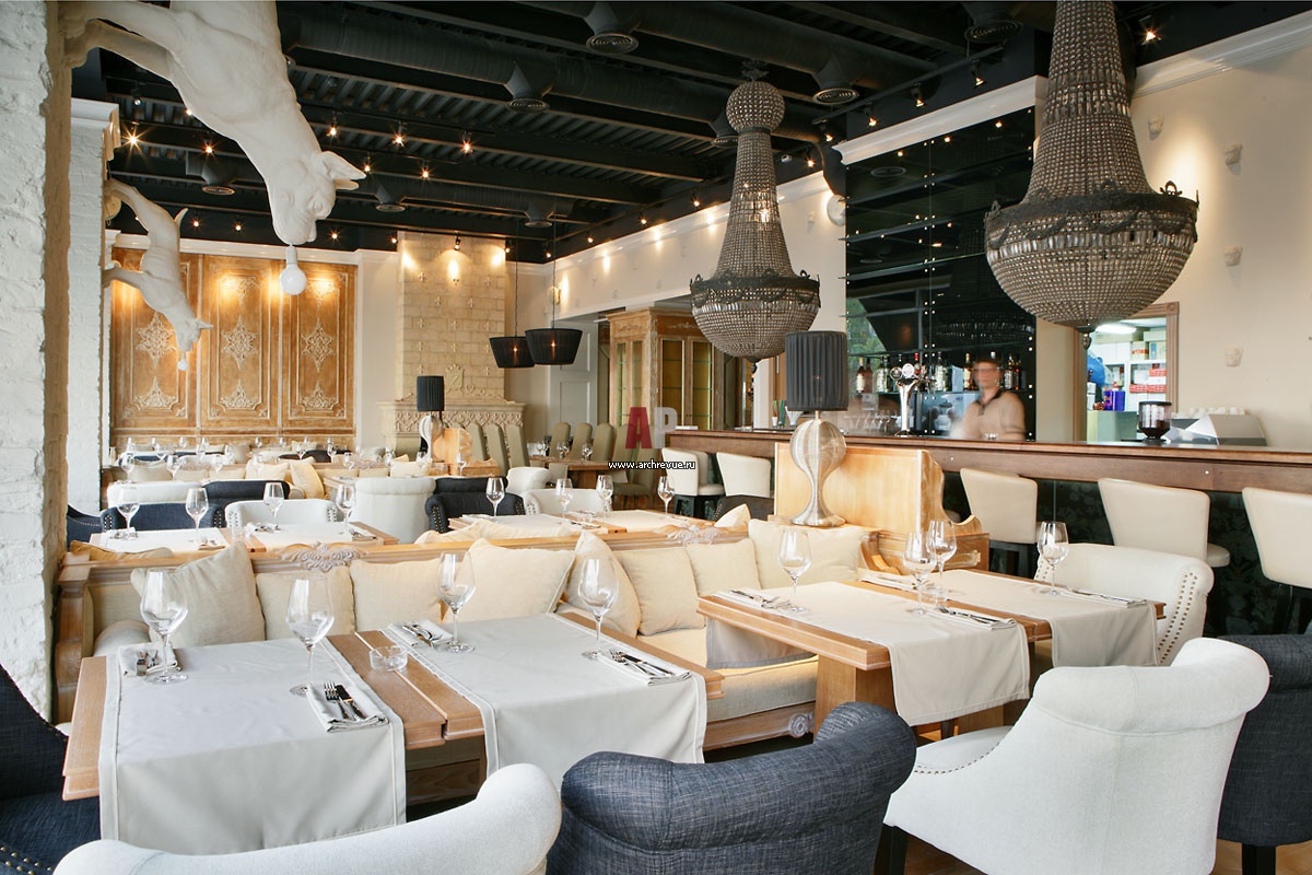 Стена напротив входа декорирована искусственно состаренными панелями из дерева, изготовление «Гардарика ». А также камином, он выполнен из шамотной глины.