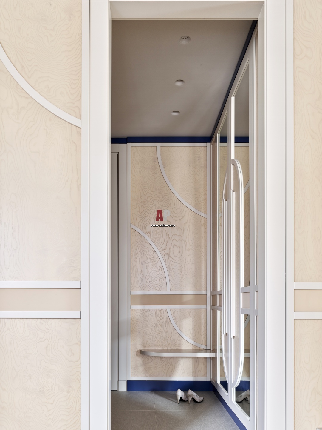Панели с отделкой шпоном корня ясеня выполнены в мастерской. Криволинейные элементы, поддерживающие пластику арочных окон, обтянуты натуральной кожей.