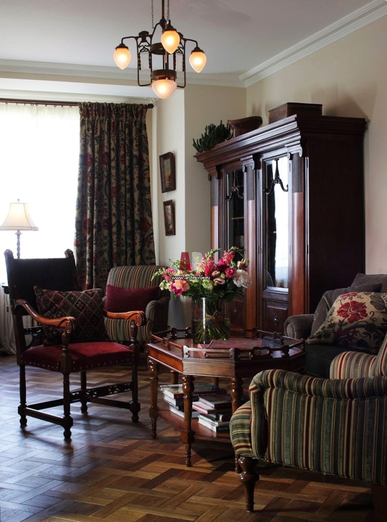 Интерьер гостиной в стиле модерн с брусничными акцентами.