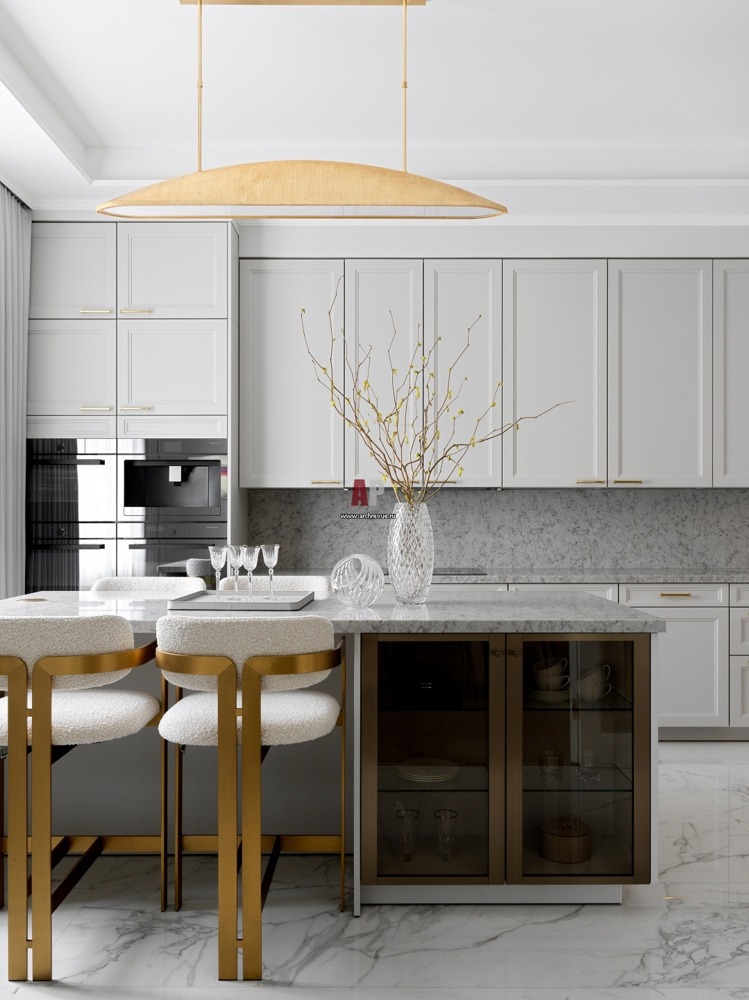 Проходная кухня. Через вход из прихожей можно занести продукты незаметно от гостей. Кухонная мебель, SieMatic. Барные стулья с латунными ножками, IDC Collection. Люстра из латуни, Kelly Wearstler.