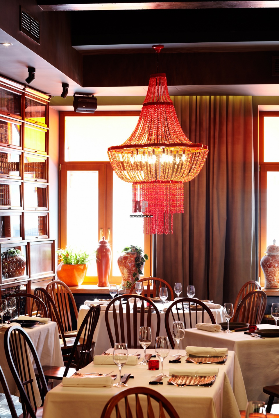Красные люстры выполнены из акриловых бусин разных размеров дизайнерами компании «Геометрия». Встроенные внутрь них красные абажуры формируют световой луч и создают камерную обстановку.