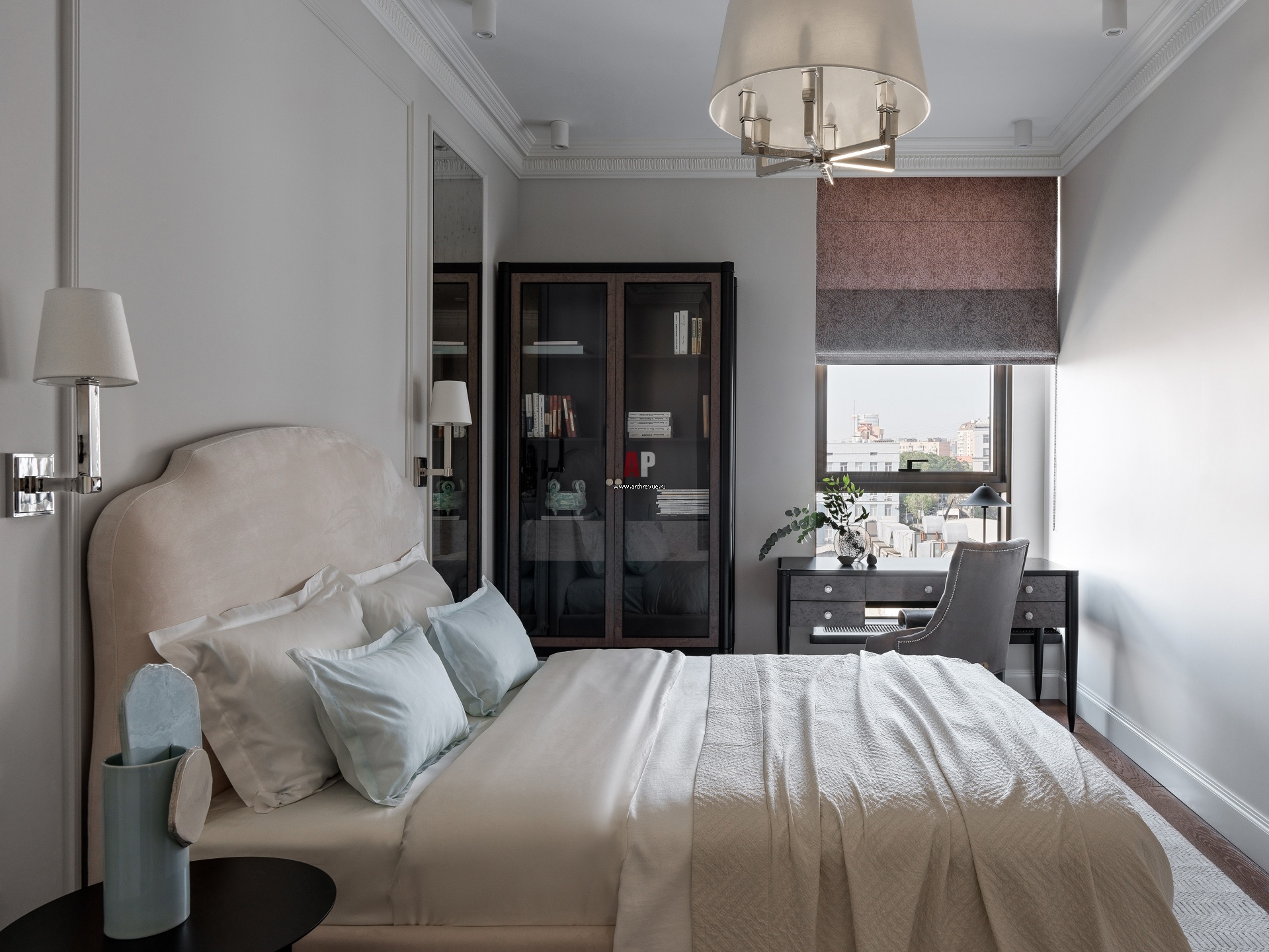 Комнаты детей вынесены в отдельную часть квартиры. Спальня дочери оформлена в нежных, пудровых тонах и дарит ощущение умиротворения и уюта. Кровать, Estetica, модель Hilton. Книжный шкаф и письменный, на заказ. Прикроватный столик, Ferm Living. Люстра, Visual Comfort & Co, модель Square Tube.