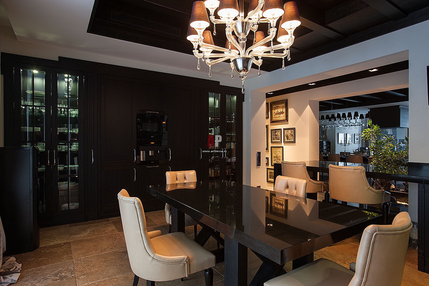 Гостиная, столовая, кухня решены в едином пространстве. Интерьер выглядит строго за счет использования мебели из темного венге. Светильники, Brand van Egmond.
