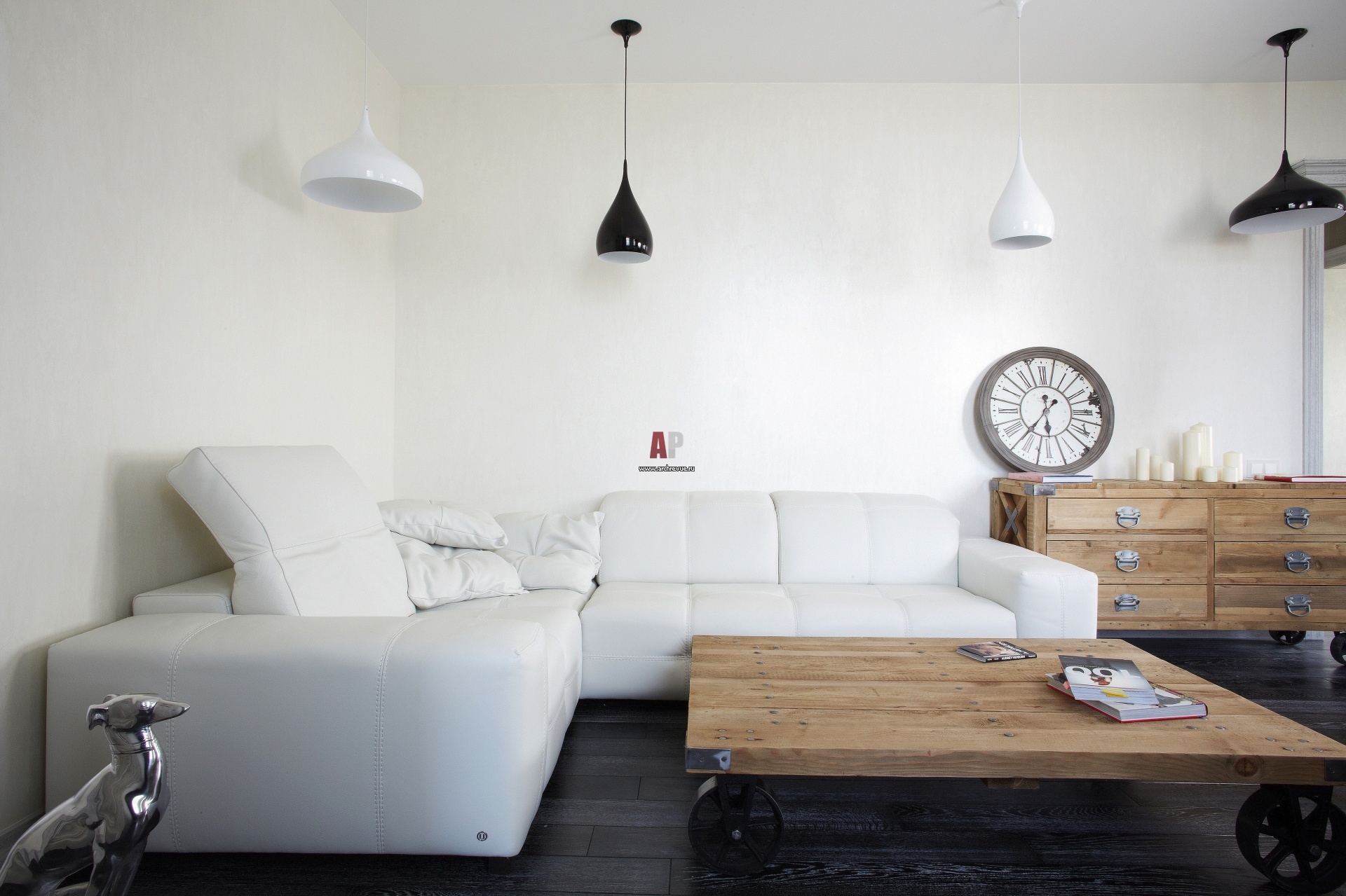 В интерьере гостиной акцентами являются большой угловой диван Natuzzi из белой кожи и массивный обеденный стол из состаренного дерева.