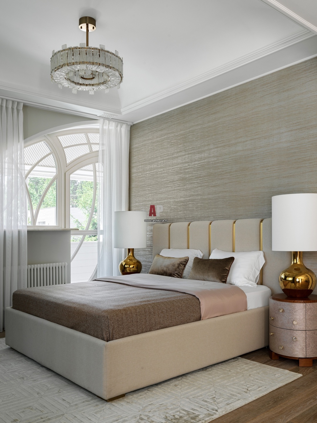 Спальня родителей оформлена в приятных и расслабляющих бежевых оттенках. На стене за изголовьем кровати – обои ручной работы, Arte. Тумбочки, Bollu.