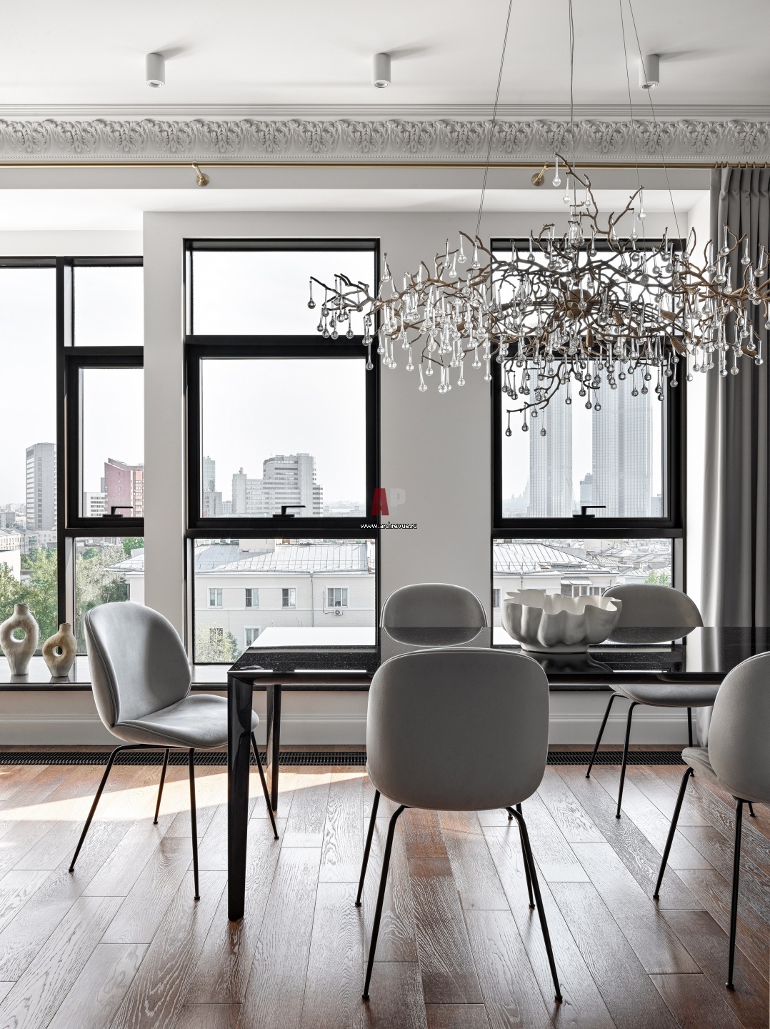 Квартира на Пресне с панорамным остеклением. Обеденная зона размещена возле окна. Стол, Molteni &C, модель Filigree. Стулья обеденные, Gubi модель Beetle Dining Chair. Люстра, Serip, модель Bijout.