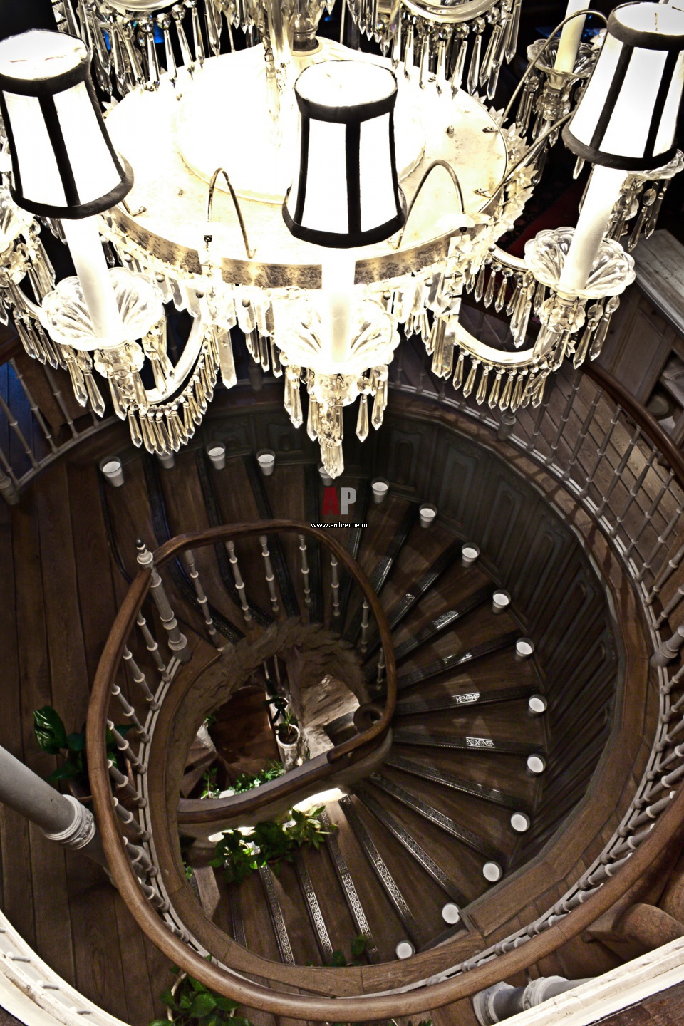 Четырехэтажный объем пронизан насквозь винтовой лестницей. Она выполнена из темного резного дерева. Парадную вертикаль акцентирует классическая люстра с хрусталем.