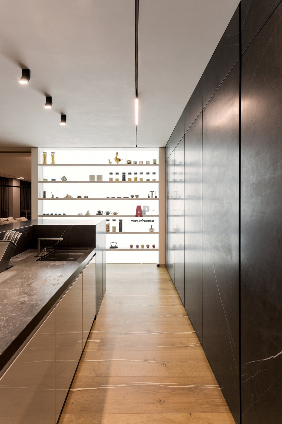 Фото интерьера современной кухни. Большая ниша с полками оформлена баннером, за которым встроены светодиоды.
