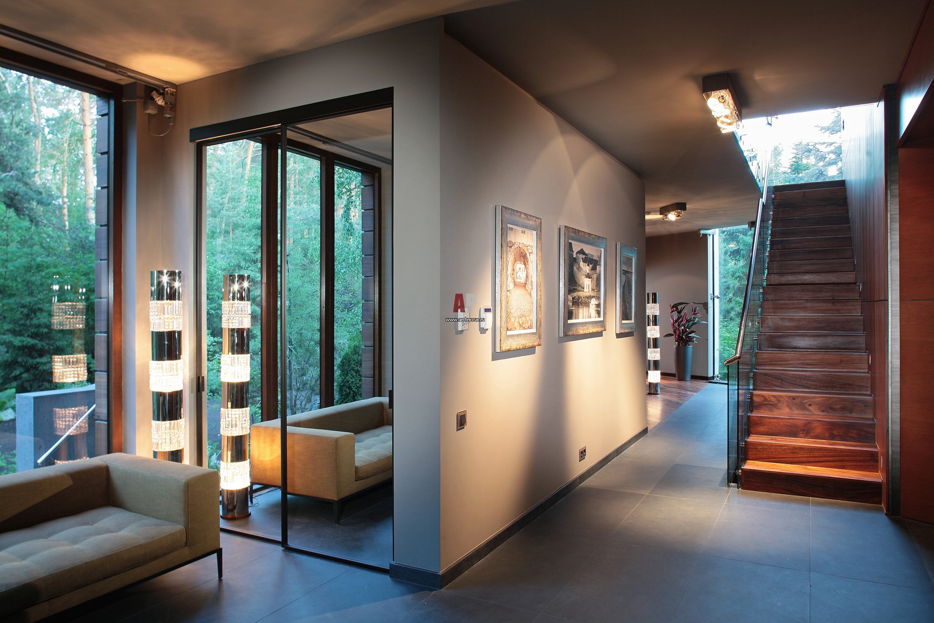 Лестница на второй этаж. Особенность архитектуры дома – панорамные окна.