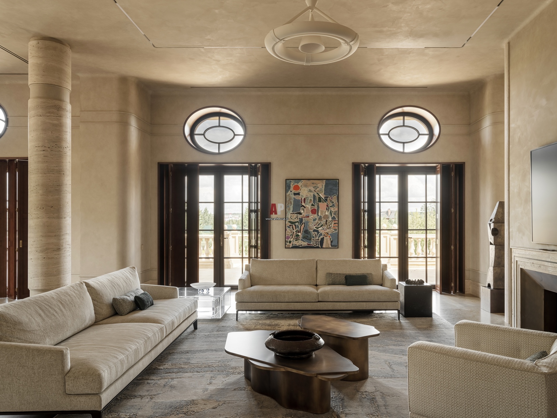 Гостиная. На полу – юрский мрамор с вкраплениями окаменелостей. Стены, потолок оформлены декоративной штукатуркой нейтрального песочного оттенка. Колонны, полуколонны облицованы травертином. Шаттерсы на окнах и оконные откосы выполнены из дерева.