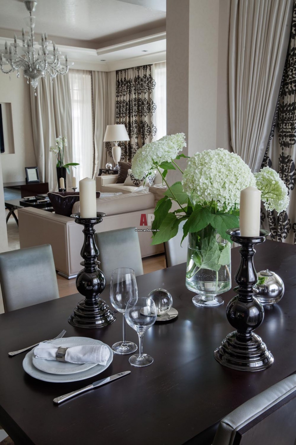 Столовая объединена с гостиной общей бежево-шоколадной колористикой и отделкой стен трафаретной росписью.