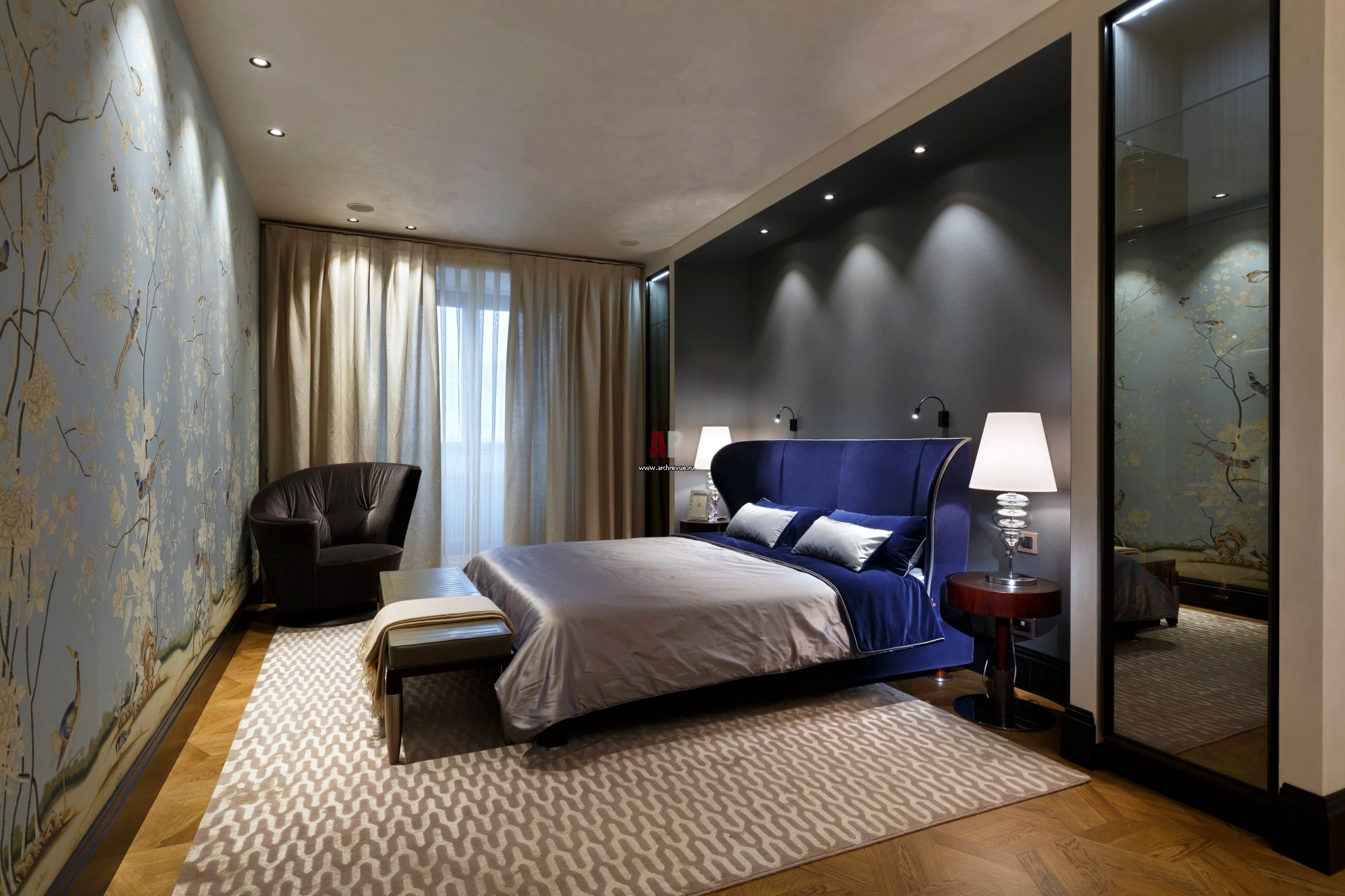 Интерьер спальни. В алькове расположена кровать Giorgetti с высоким изголовьем в антрацитово-синей обивке. По обе стороны от кровати – высокие зеркальные витрины, Porro. Обои затянуты шелковыми обоями с ручной росписью, De Gournay.
