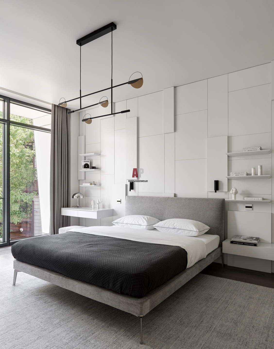 Белая спальня. Кровать и кресло, Flexform. Орнаментика стены за кроватью рифмуется со сложной пластикой фасадов.